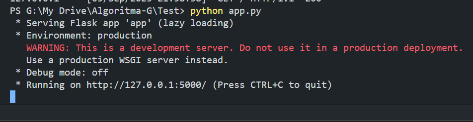 Kemudian, silahkan save app.py yang telah dibuat dan silahkan untuk menjalankan aplikasi yang telah dibuat pada terminal.