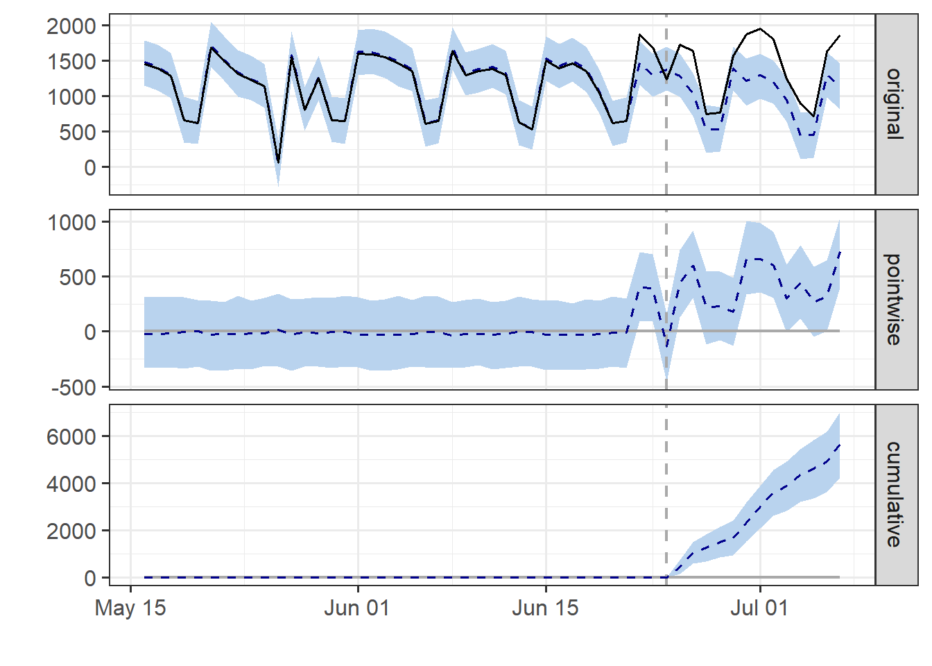 Secara default, plot berisi dari tiga panel. Panel pertama original menunjukkan data dan prediksi kontrafaktual untuk periode pasca kampanye. Panel kedua pointwise menunjukkan perbedaan antara data aktual yang diamati (leads) dan prediksi. Panel ketiga cumulative menggambarkan efek kumulatif dari intervensi (kampanye) yang dilakukan.