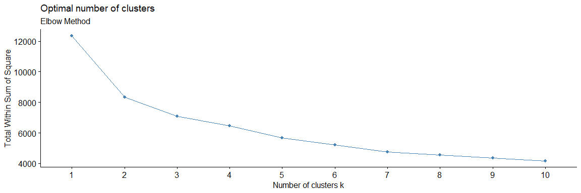 Dari plot di atas dapat dilihat bahwa 2 adalah jumlah kelompok yang optimum. Karena setelah k=2, penambahan jumlah kelompok tidak mengakibatkan penurunan jumlah nilai WSS yang signifikan.