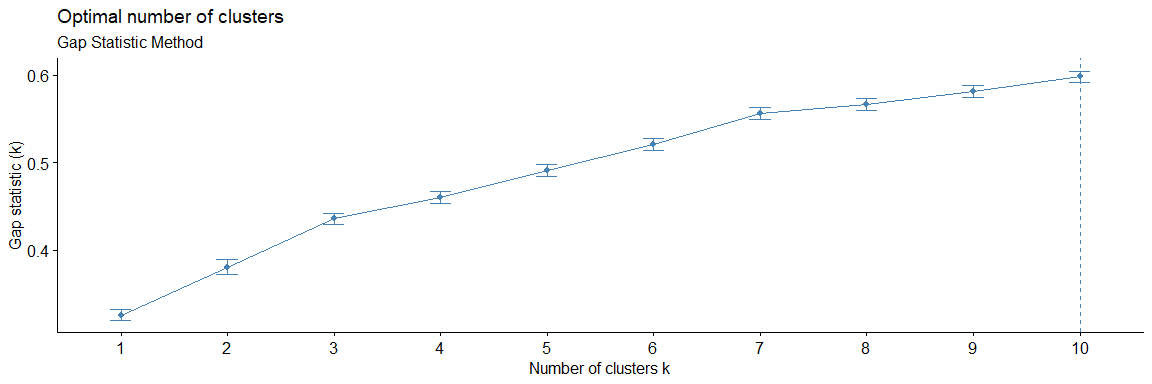 Metode terakhir yang akan digunakan adalah Gap Statistic Method, metode ini akan menghitung seberapa berbeda total variansi antara setiap observasi pada sebuah kelompok terhadap observasi yang terdapat pada kelompok lainnya.