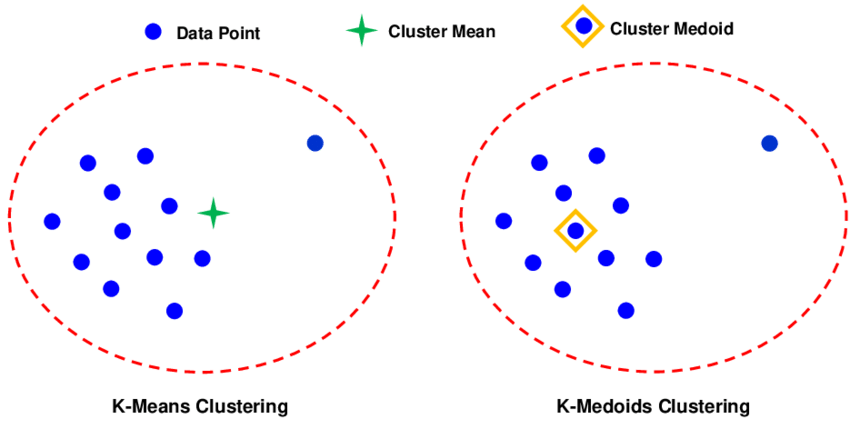 Pada metode K-Means, penentuan sebuah objek masuk ke sebuah cluster tertentu berdasarkan perhitungan rata-rata jarak ecluidean. Sedangkan cara kerja metode K-Medoids akan diawali dengan penentuan Medoids (sebuah objek yang letaknya terpusat di dalam suatu cluster). Dari gambar di bawah, kita dapat melihat bagaimana perbedaan antara metode K-Means & K-Medoids dalam menentukan sebuah objek lebih sesuai untuk masuk ke sebuah cluster tertentu.