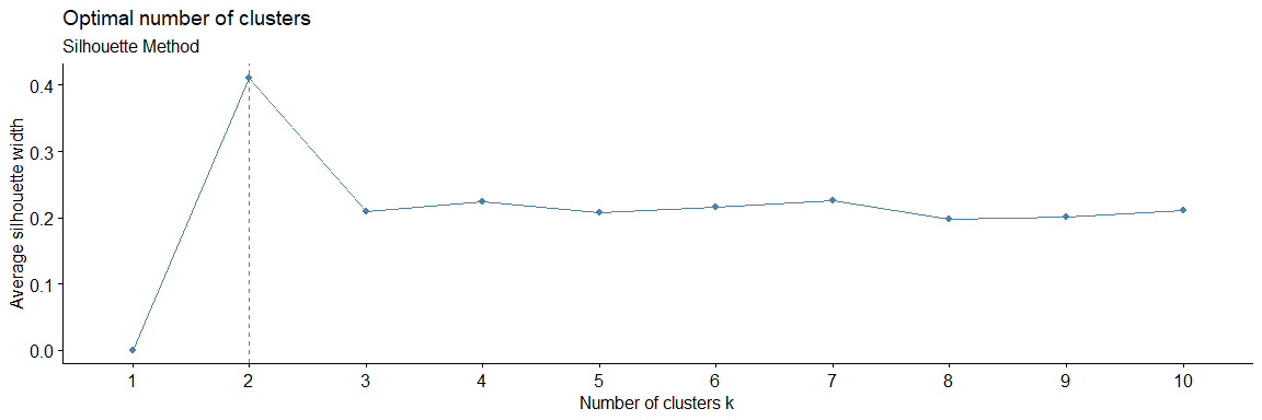 Metode kedua yang akan dicoba untuk menentukan jumlah kelompok yang optimal adalah Silhouette Method. Metode ini akan menghitung seberapa mirip sebuah observasi dengan kelompoknya sendiri jika dibandingkan dengan nilai kelompok lainnya. Hasil dari perhitungannya akan memiliki rentan koefisien dari -1 sampai 1. Jika nanti hasilnya makin mendekati 1 maka observasi tersebut cocok dengan kelompoknya dan kurang cocok dengan kelompok tetangga, begitu juga sebaliknya, jika hasilnya makin mendekati -1 maka observasi tersebut tidak cocok dengan kelompoknya akan tetapi lebih cocok dengan kelompok tetangganya.