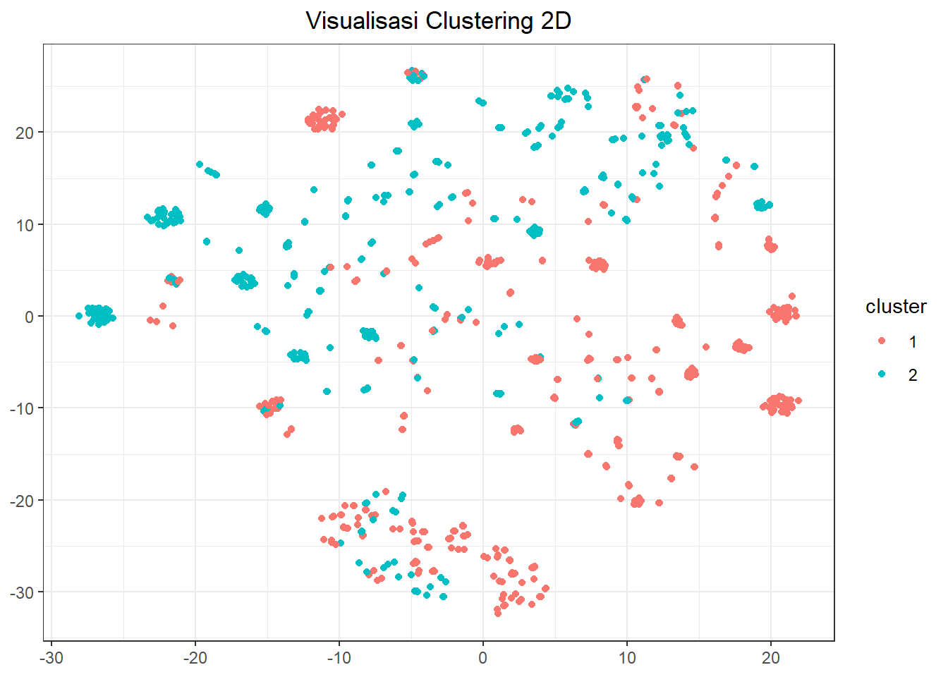 Jika dengan menggunakan metode statistik deskriptif kita bisa memahami karakteristik dari masing-masing kelompok, metode visualisasi dapat membantu kita untuk menilai bagaimana hasil pengelompokan. Metode visualisasi yang akan digunakan adalah metode t-SNE, metode ini merupakan salah satu cara untuk memvisualisasikan data yang tidak hanya memiliki nilai numerik saja melainkan nilai kategorikal juga.