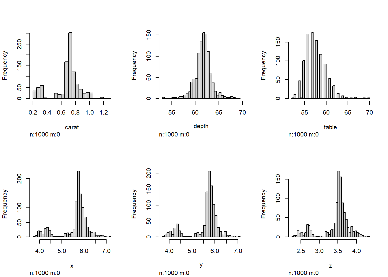 #> Median :0.7100 Ideal :333 F:226 VS1 :159 Median :61.80