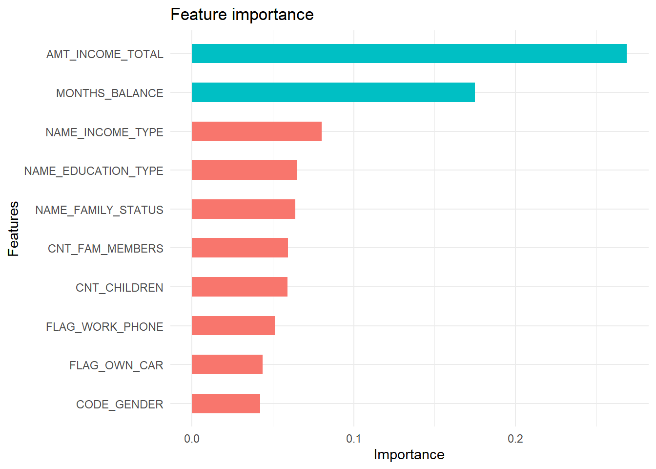 Grafik di atas menampilkan informasi mengenai 10 variabel yang paling berpengaruh pada model. Annual income dan months balance merupakan dua variabel terpenting pada model ini.