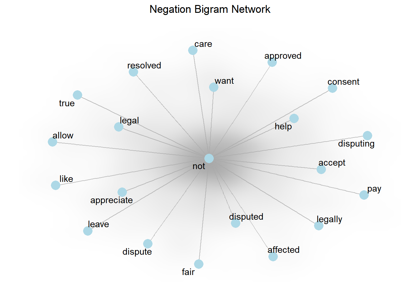 Sentiment Analysis yang dilakukan sebelumnya kita memperhitungan kemunculan kata positif dan negatif. Salah satu kelemahan pada pendekatan tersebut terkadang dapat disalah artikan penggunaannya pada sebuah kata, misal correct dan support akan dianggap sebagai kata positif. Namun, arti kata tersebut akan berubah jika terdapat kata not didepannya. Pada analisis berikut ini kita akan menggunakan n-gram untuk melihat seberapa sering word1 diikuti oleh word2. Tokenisasi menggunakan n-gram berguna untuk eksplorasi kata yang memiliki hubungan. Ketika kita mengatur n = 2 artinya kita akan menampilkan dua kata berturut-turut atau sering disebut dengam bigrams. Hasil dari visualisasi berikut ini menampilkan kata-kata yang berhubungan dengan kata not.