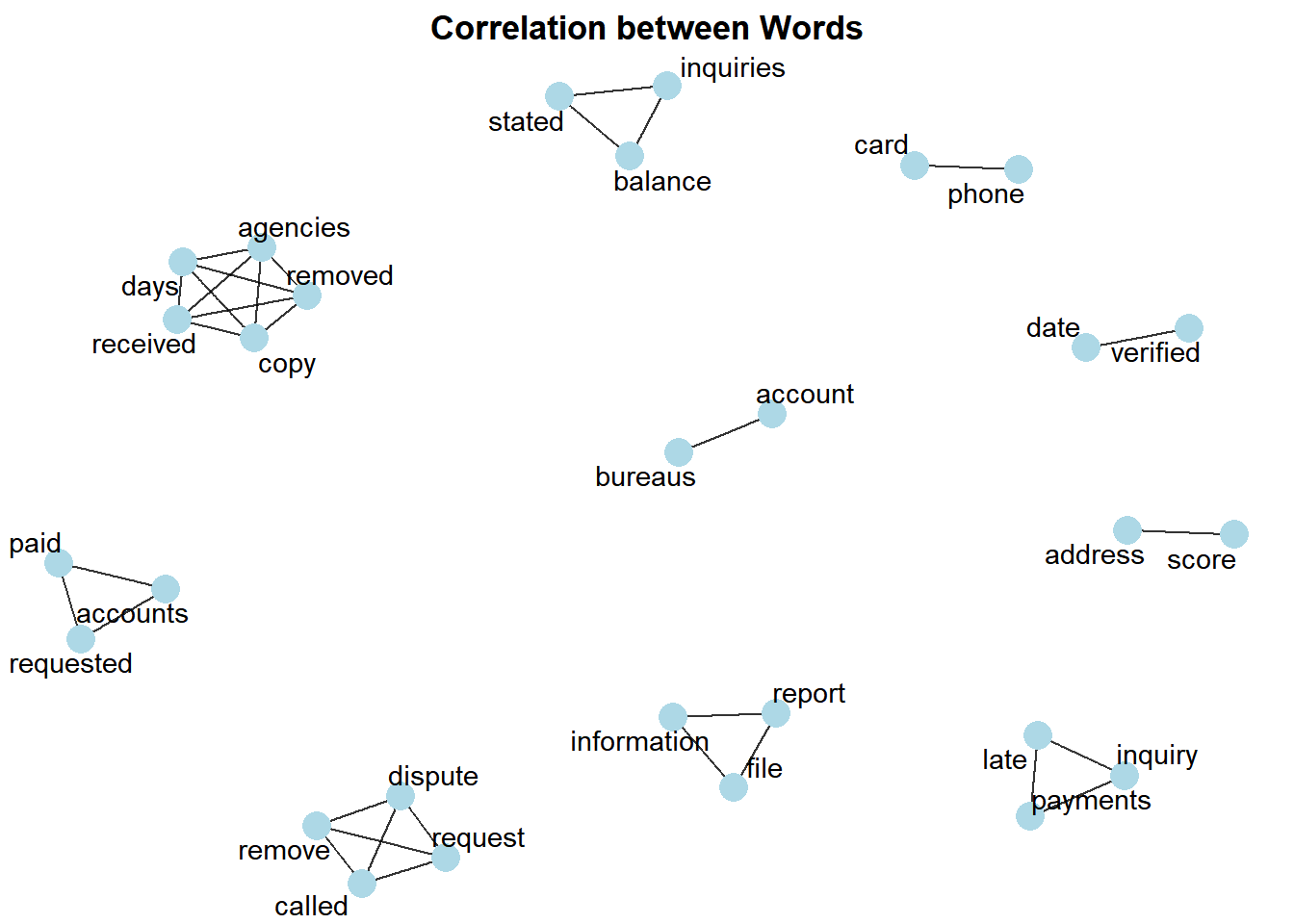 Korelasi antar kata dapat kita tampilkan secar visual menggunakan package ggraph. Pada visualisasi berikut kita hanya ingin menampilkan kata yang memiliki korelasi lebih dari 0.9. Artinya korelasi pada visualisasi berikut memiliki kecenderungan muncul bersamaan saat nasabah mengajukan complain.