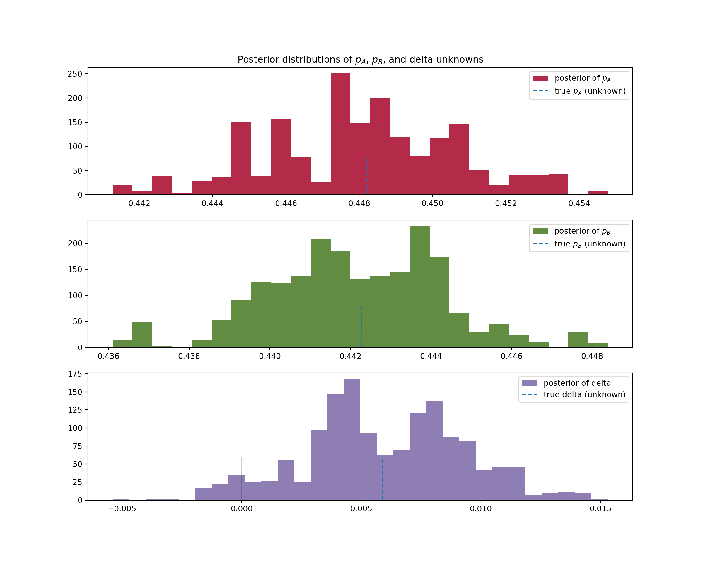 #> Text(0.5, 1.0, 'Posterior distributions of $p_A$, $p_B$, and delta unknowns')