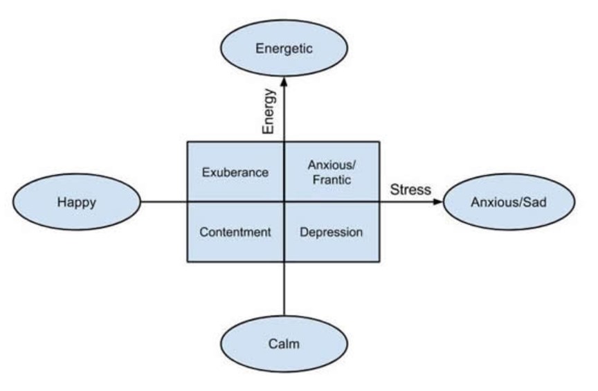 Klasifikasi mood berdasarkan musik berdasarkan tradisional model mood oleh seorang psikologis Robert Thanyer membedakan setiap mood berdasarkan energi dan stres sebagai bentuk mood senang, sedih, tenang, dan energetik5. Empat jenis mood ini yang akan kita jadikan acuan dalam mengelompokkan data lagu yang kita miliki untuk dikelompokkan menjadi 4 kelompok.