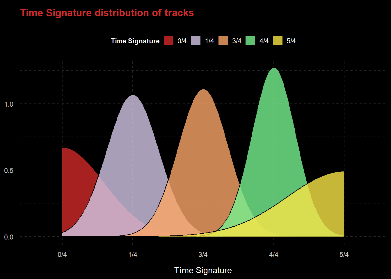 Bisa dikatakan bahwa dari keseluruhan dataset, banyak musik yang memiliki time signature 1/4 - 4/4.