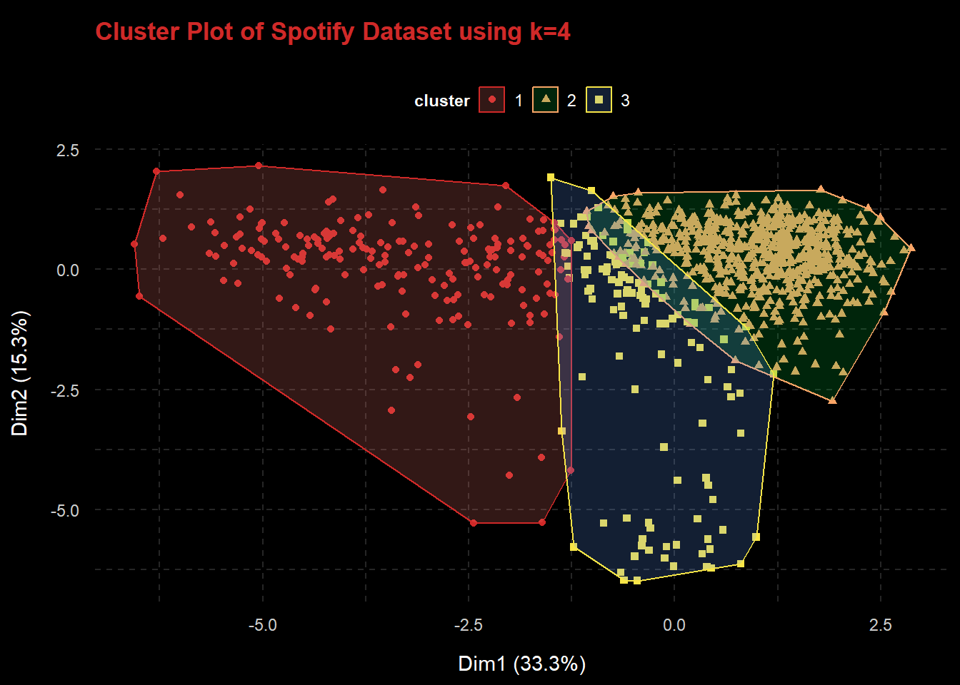 Clustering mood yang dilakukan pada beberapa lagu Spotify hanya menggunakan komponen pada suatu musik itu sendiri. Menggunakan 1000 lagu secara random yang diperoleh ternyata belum bisa mengelompokkan menjadi 4 mood yang diinginkan sebelumnya sehingga pada data yang digunakan lebih cocok dikelompokkan menjadi 3 mood: energic, happy, dan sad/calm. Menggunakan 3 cluster, setiap cluster memiliki karakteristik yang cukup berbeda walaupun untuk cluster dengan mood energic dan happy sedikit memiliki kemiripan secara karakteristik. Dalam kasus ini, cluster yang baik adalah cluster yang memiliki nilai Dunn index yang tinggi.
