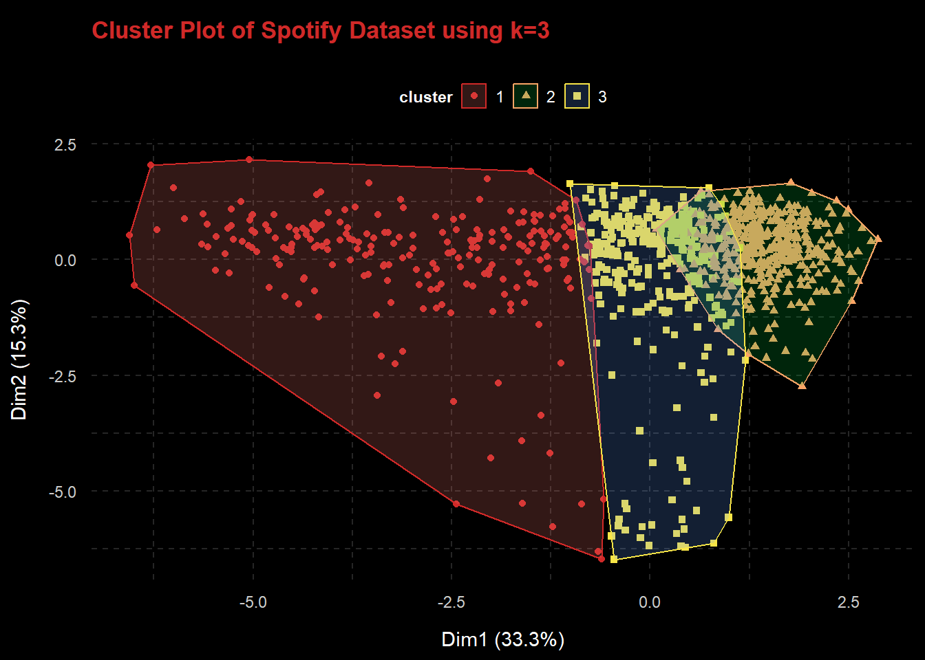 Boom!!! Hasilnya sama dengan ketika menggunakan k=4. Oleh karena itu, kita akan menggunakan k=3 yang artinya kita hanya akan mengklasifikasikan mood menjadi 3 jenis mood.Selain itu apabila kita lihat berdasarkan nilai Dunn index yang dihasilkan ketika membentuk 3 cluster, maka nilai Dunn index naik menjadi 0.388 yang artinya dengan k=3 lebih baik dibandingkan k=4.