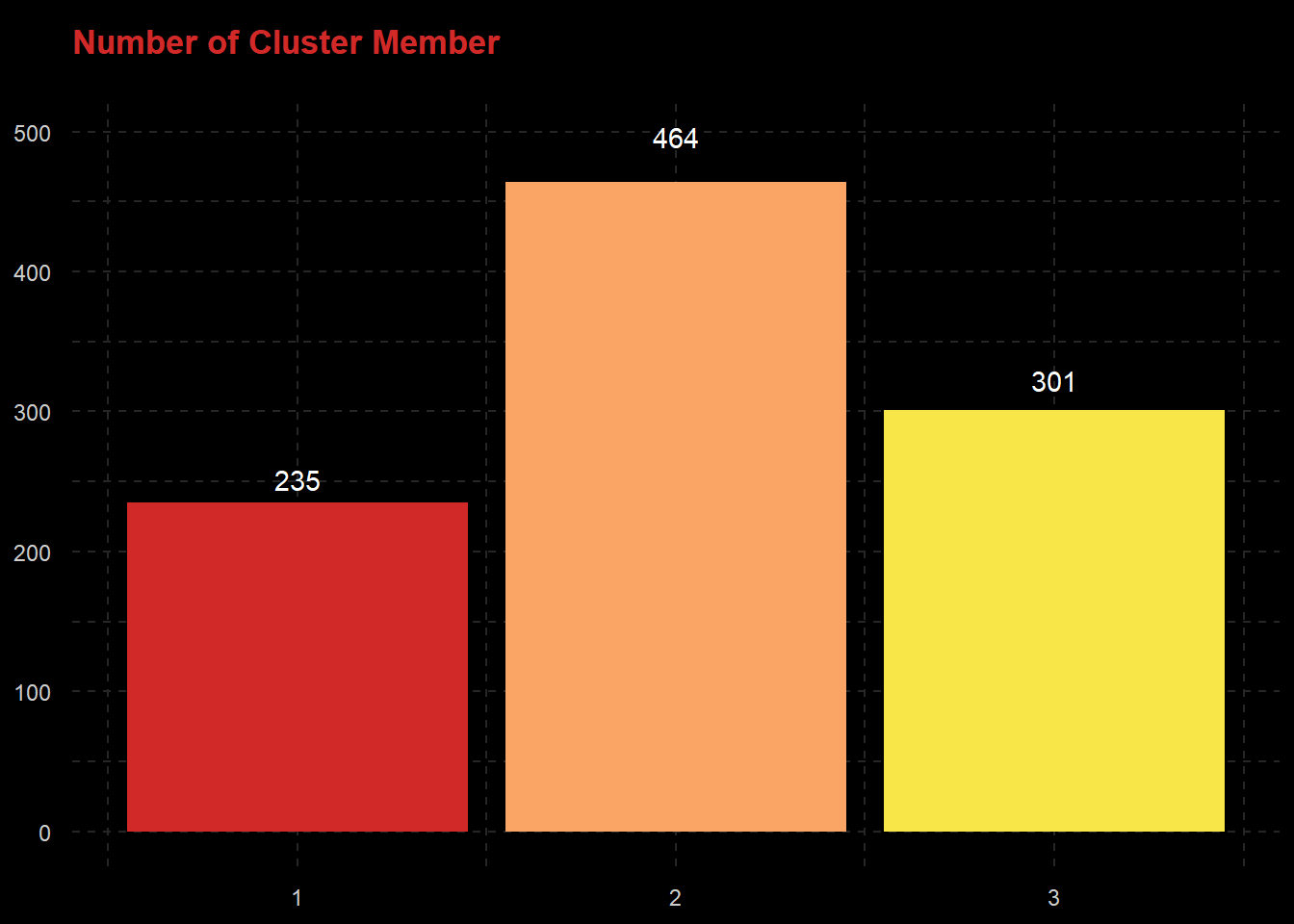 Cluster yang telah terbentuk terdapat 3 cluster. Anggota dari masing-masing cluster juga tentunya berbeda. Jika kita perhatikan, cluster yang paling banyak memiliki anggota adalah cluster 2 sebanyak 464 data, diikuti dengan cluster 3 sebanyak 301 data, dan cluster 1 sebanyak 235 data.