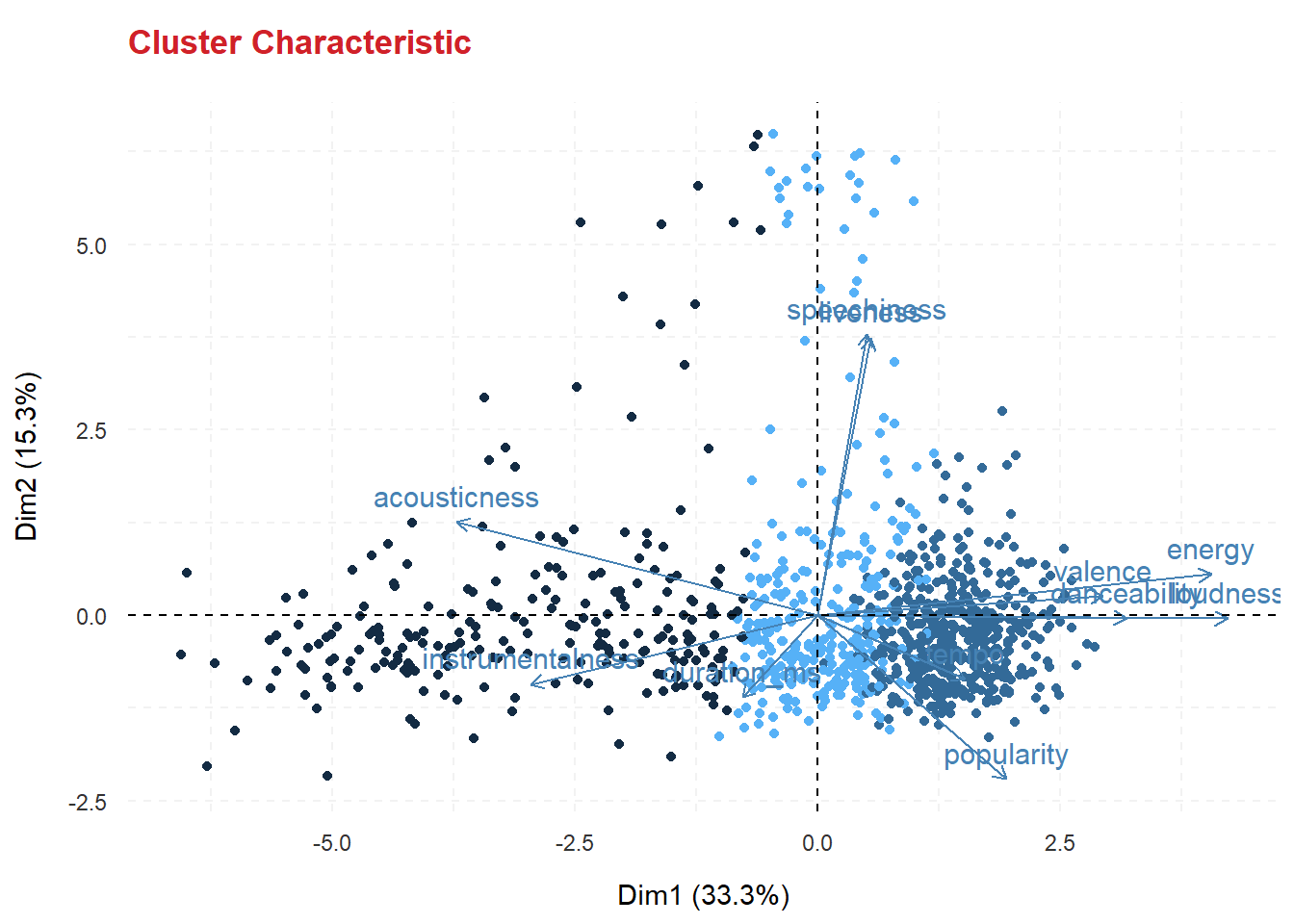 Cluster 1 merupakan cluster yang memiliki tingkat valence, energy, danceability, loudness, tempo, dan popularity yang tinggi. Cluster ini memiliki banyak anggota 235 data.