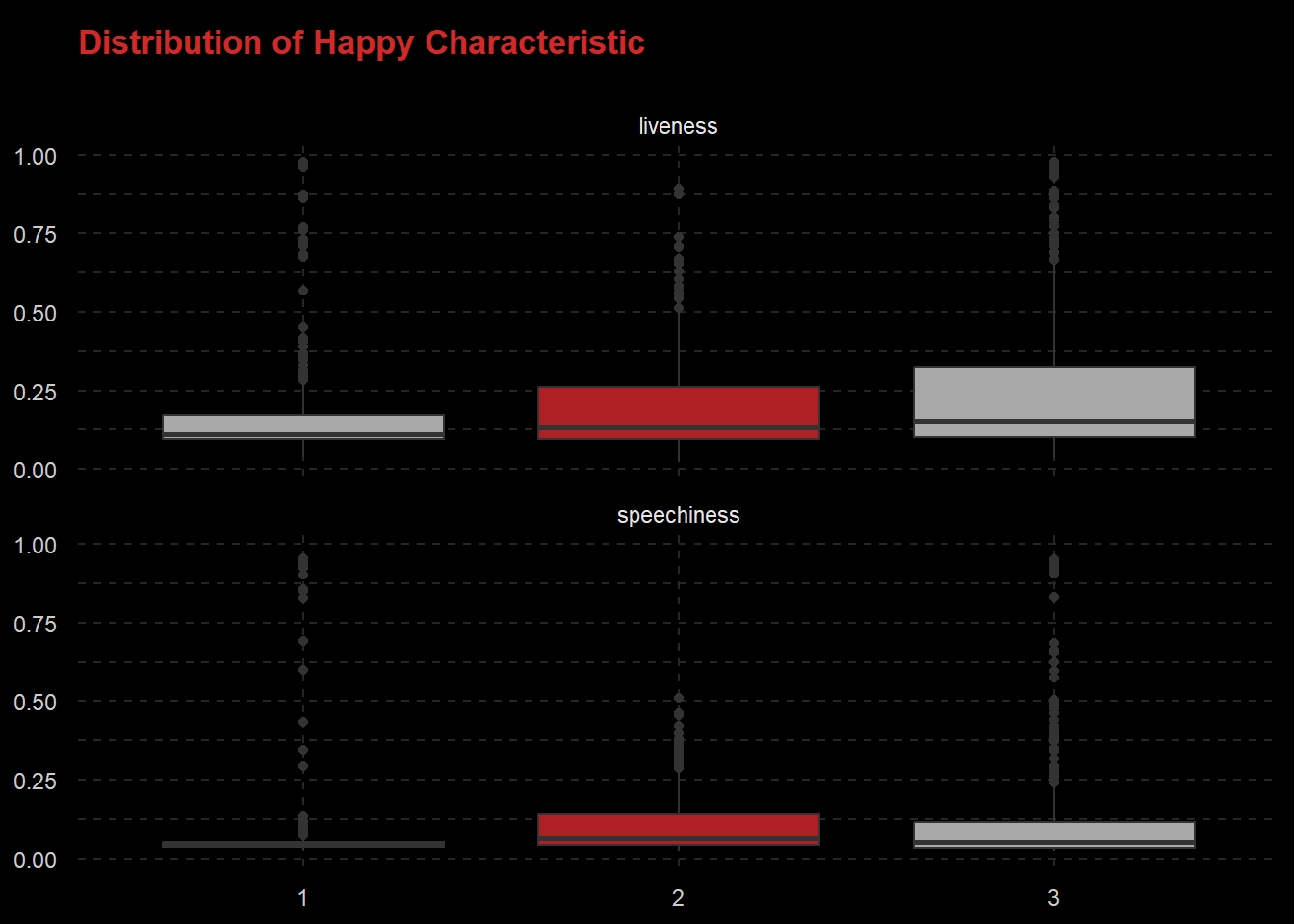 Cluster 2 merupakan cluster yang memiliki anggota paling banyak dengan banyak anggota sebanyak 464 data. Cluster 2 ini dicirikan sebagai penggambaran mood happy. Nilai speechiness dan liveness terlihat sangat tinggi untuk cluster ini.
