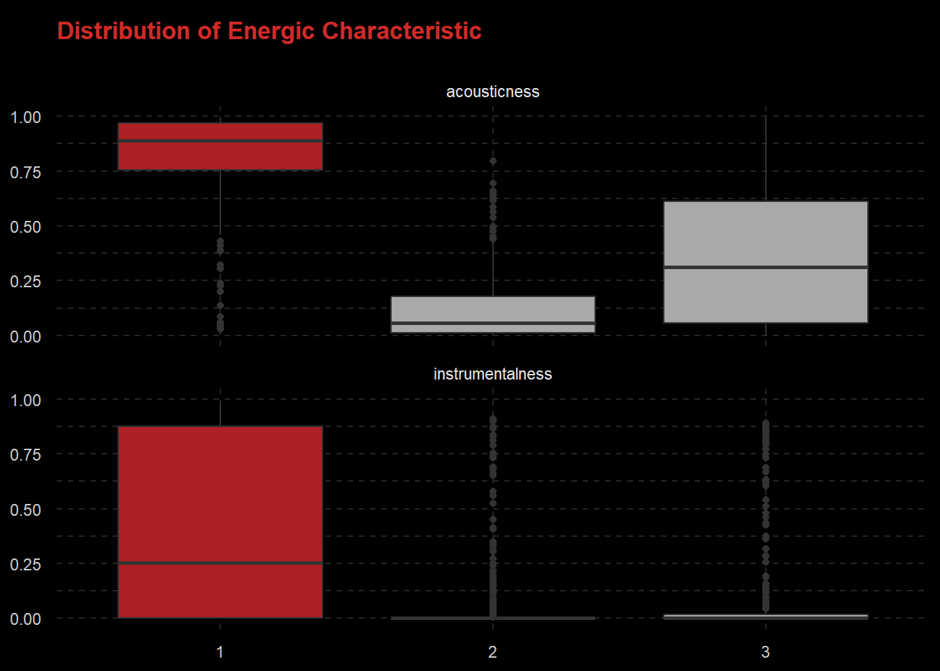 Cluster 3 merupakan cluster dengan tingkat acousticness dan instrumentalness sangat tinggi. Hal ini bisa mengindikasikan bahwa tipe mood yang bisa diklasifikasikan adalah mood sad (sedih) atau mood calm.