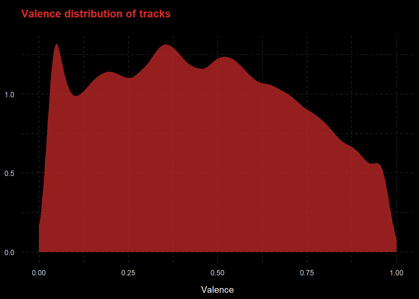 Beberapa track yang ada pada data ternyata memiliki nilai valence 0 dan kebanyakan dari track memiliki nilai valence kurang dari 0.5. Hal ini bisa menjadi indikasi bahwa berdasarkan data yang kita miliki memungkinkan sebaran track yang bernuansa negatif (marah, sedih, tertekan) lebih banyak dibandingkan track dengan nuansa positif.