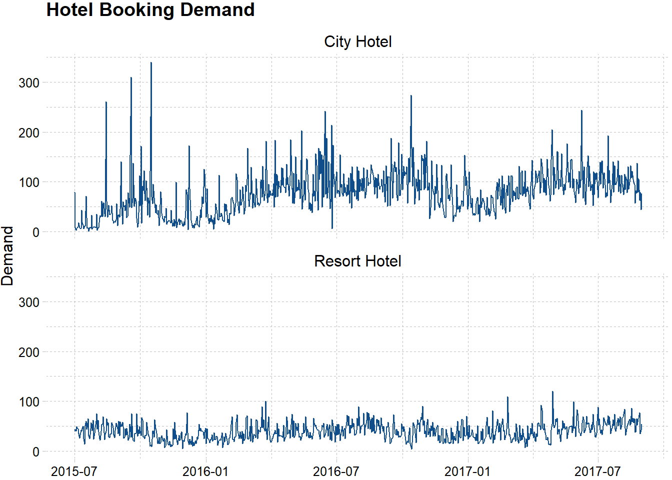 Let’s import the dataset. The data is acquired from Nuno et al. (2019) . The data consists of around 119,390 booking transactions from 2 hotel: an anonymous city hotel from Lisbon and a resort hotel from Algarve. The dataset comprehend bookings due to arrive between the 1st of July of 2015 and the 31st of August 2017, including bookings that effectively arrived and bookings that were canceled. There is so much to explore from this data, but we will only focus on demand forecasting.