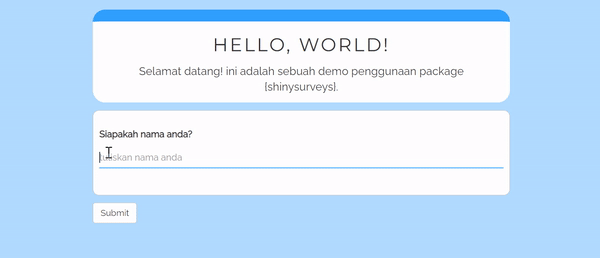 {shinysurveys} merupakan sebuah package yang dikembangkan oleh Jonathan Tratnerr yang terinspirasi oleh {shinyforms} yang dikembangkan oleh Dean Attali’s. package ini membuat survei dengan tampilan yang mirip seperti Google Forms dengan menggunakan kode yang minimalis dan mudah untuk digunakan.