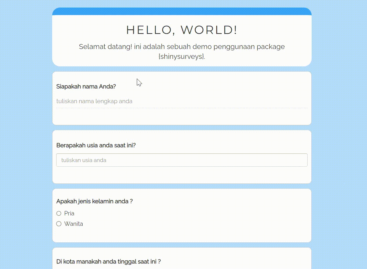 Berikut ini adalah contoh untuk pembuatan pertanyaan dengan tipe-tipe input yang sudah disediakan dari package shinySurveys: