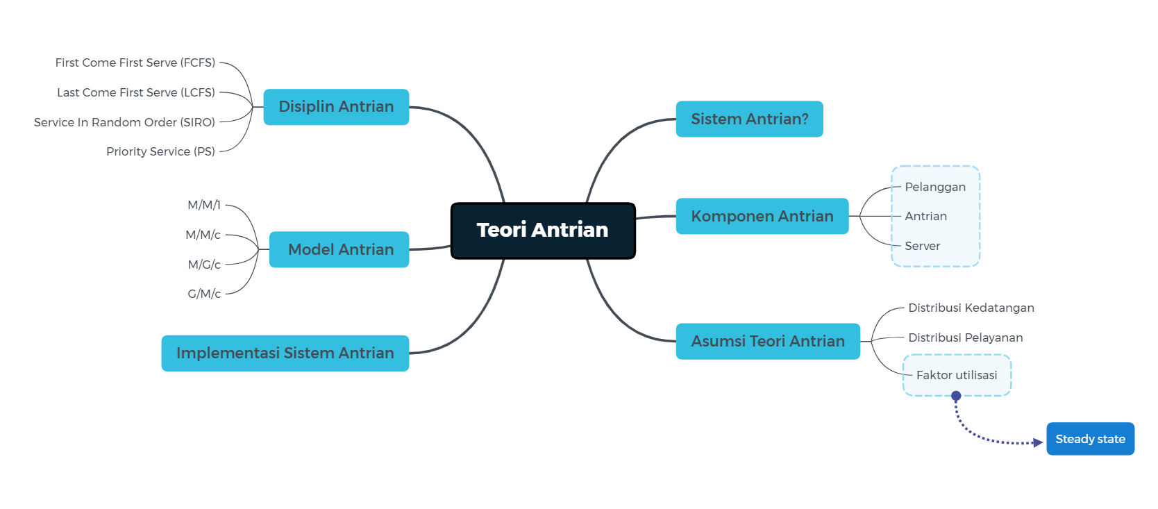 Perhitungan dalam teori antrian berdasarkan syarat bahwa sistem berada dalam kondisi tetap (steady state). Hal ini manjadikan harus diperhatikannya nilai rata-rata pelayanan lebih besar dari nilai rata-rata kedatangan. Perhitungan untuk mencari nilai ukuran steady state adalah sebagai berikut: