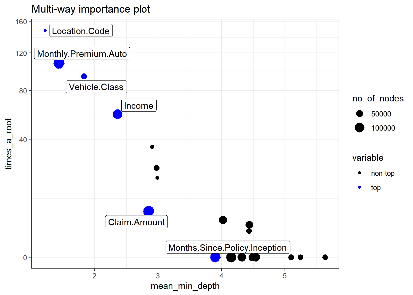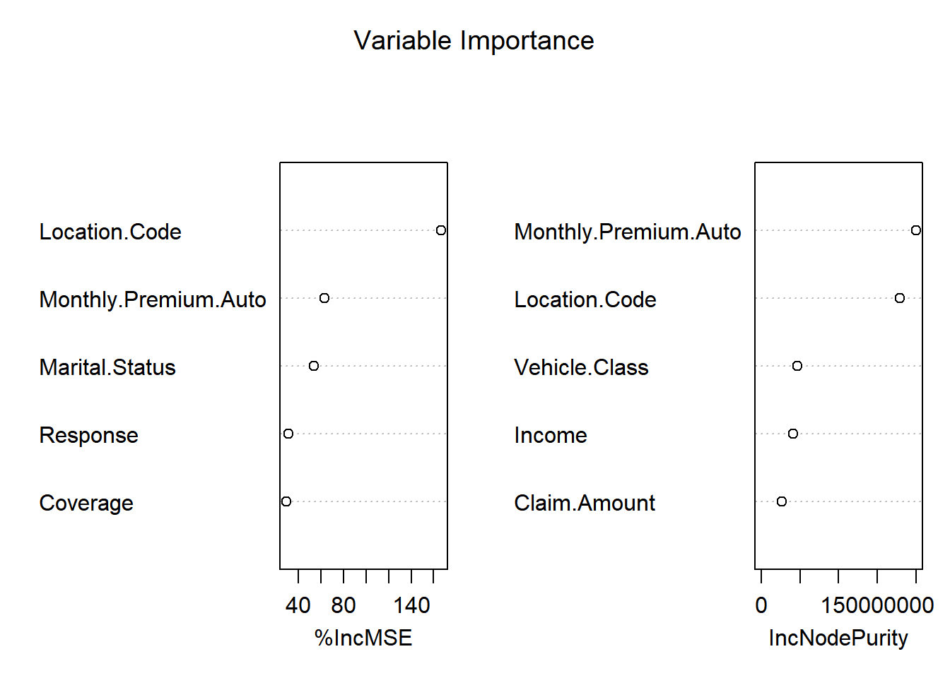 Perbandingan dari ketiga plot, terdapat 5 variabel yaitu location code, monthly premium auto, vehicle class, income, dan claim amount yang selalu muncul dari ketiga plot tersebut. Artinya kelima variabel tersebut dapat dikatakan variabel yang paling berpengaruh dan banyak digunakan dalam pembuatan pohon.