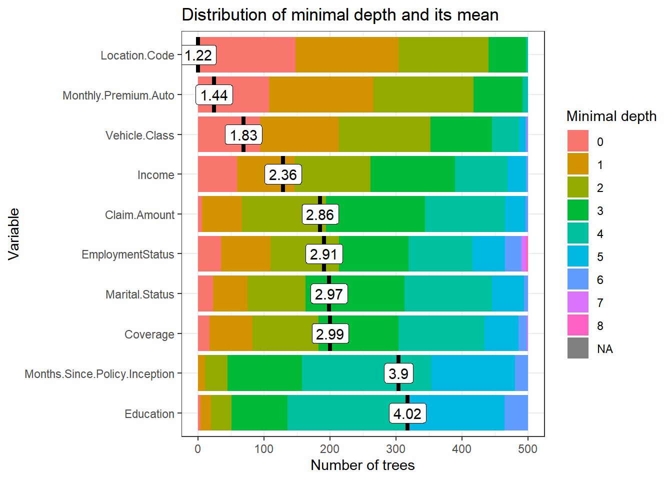 Plot tersebut memberikan informasi mengenai nilai mean minimal dept untuk setiap variabel. Semakin kecil nilai minimal depth artinya semakin penting variabel tersebut pada model. Semakin besar proporsi minimal dept pada warna merah mudah (mendekati 0), artinya variabel tersebut sering dijadikan sebagai root node, yaitu variabel utama yang digunakan untuk menentukan nilai target.