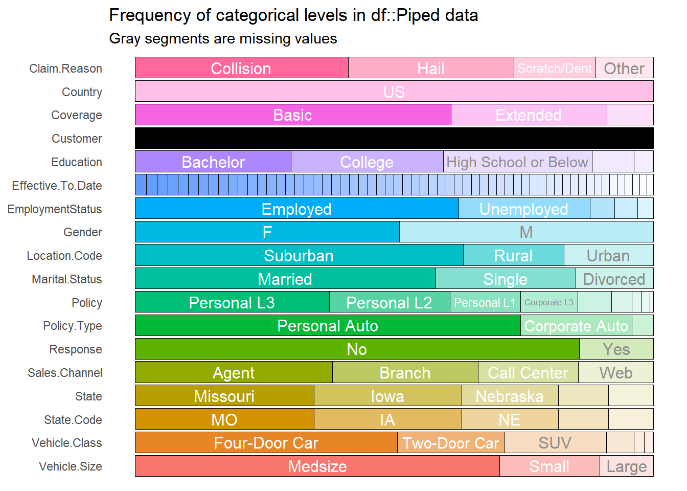 #> Claim.Reason Sales.Channel Total.Claim.Amount Vehicle.Class Vehicle.Size