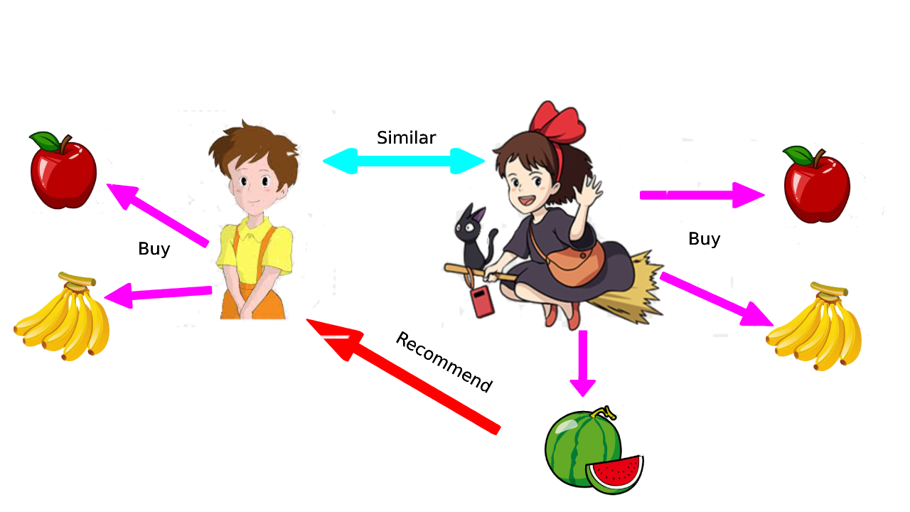From the ilustration above, information given that Kiki (girl with black cat) likes to buy apple, banana, and watermelon. While Satsuki (girl with yellow shirt) likes to buy apple and banana. They have similar taste in apple and banana, so we can recommend Satsuki to buy watermelon.