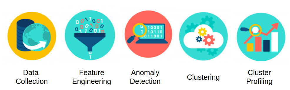 Data Collaction: Pengumpulan data dari berbagai sumber.Feature Engineering: Mengekstrak feature/ informasi dari data yang ada.Anomaly Detection: Mencari data yang bersifat anomali dan menghapusnya sehingga tidak mengganggu cluster yang akan dibentuk.Clustering: Mengelompokkan data menjadi beberapa kelompok berdasarkan karakteristik data.Cluster Profiling: Mencari karakteristik dari setiap cluster yang sudah terbentuk.
