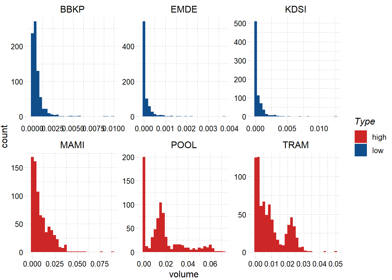 Setelah dilakukan penyesuaian pada volume, range dari nilai volume sekarang dari 1 hingga 0. saham dengan tingkat likuiditas terbesar dan terendah berdasarkan median volume dapat dilihat pada plot histogram dibawah.Plot dengan warna merah merupakan saham paling likuid, sedangkan plot yang berwarna biru merupakan saham tidak liquid.