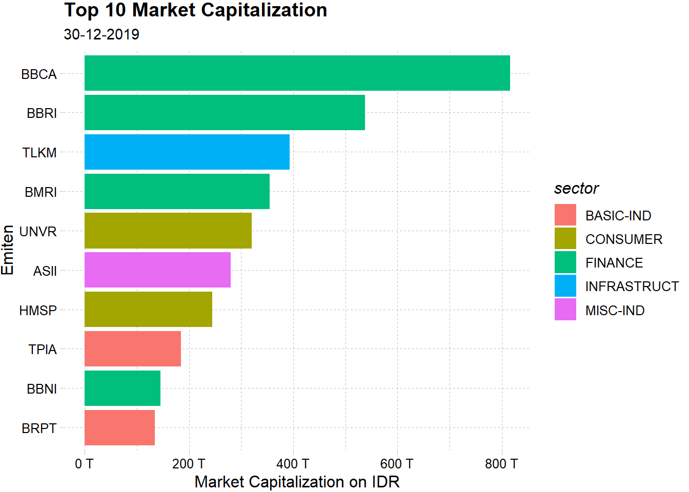 Market capitalization terbesar di Indonesia adalah BBCA dengan nilai lebih dari 800 T pertanggal 30 Desember 2019. Market cap besar didominasi dari sektor finance khususnya perbankan (BBCA, BBRI, BMRI,BBNI).