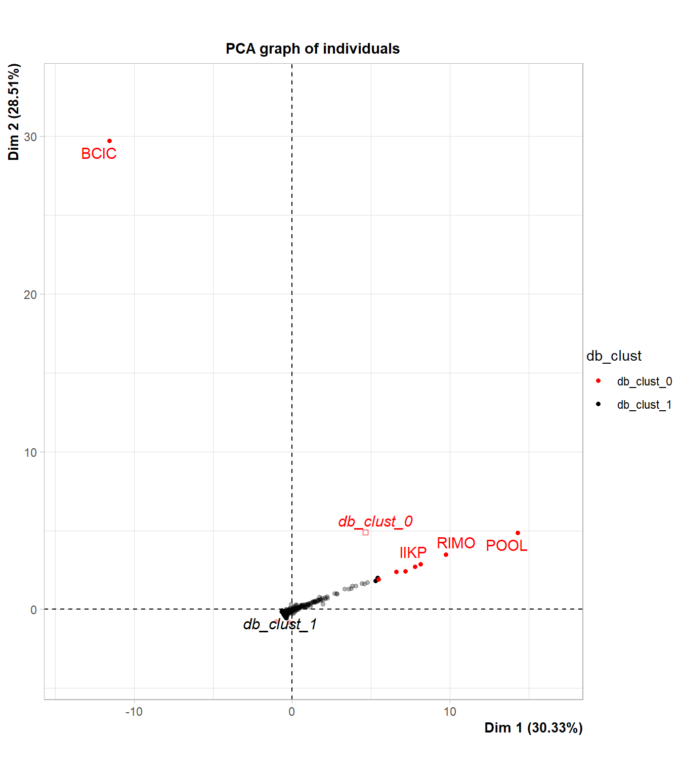 Emiten yang diindikasikan sebagai outlier adalah ATIC, BCIC, IIKP, LEAD, MAMI, MYRX, OCAP, POOL, RIMO, TRAM. Untuk melihat seberapa ekstream outlier tersebut secara visual dapat digunakan visualisasi biplot. Biplot merupakan teknik visualisasi dari hasil Principal Component Analysis (PCA)9. PCA merupakan teknik mereduksi dimensi dengan mempertahankan informasi sebanyak mungkin. Fungsi yang digunakan dalam pembuatan PC adalah PCA(), dan untuk untuk membuat biplot menggunakan plot.PCA() dari package FactoMineR.