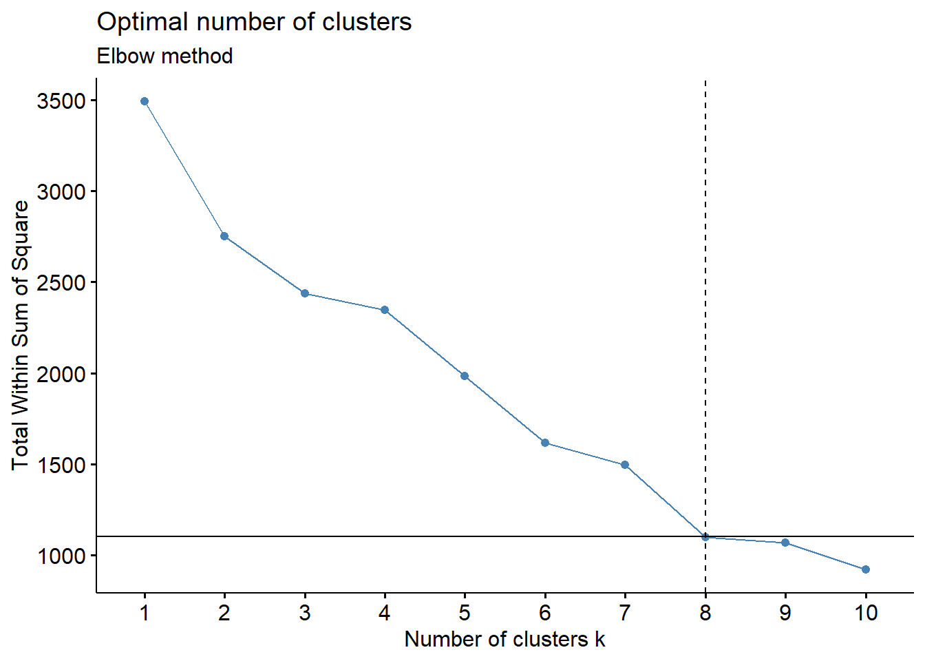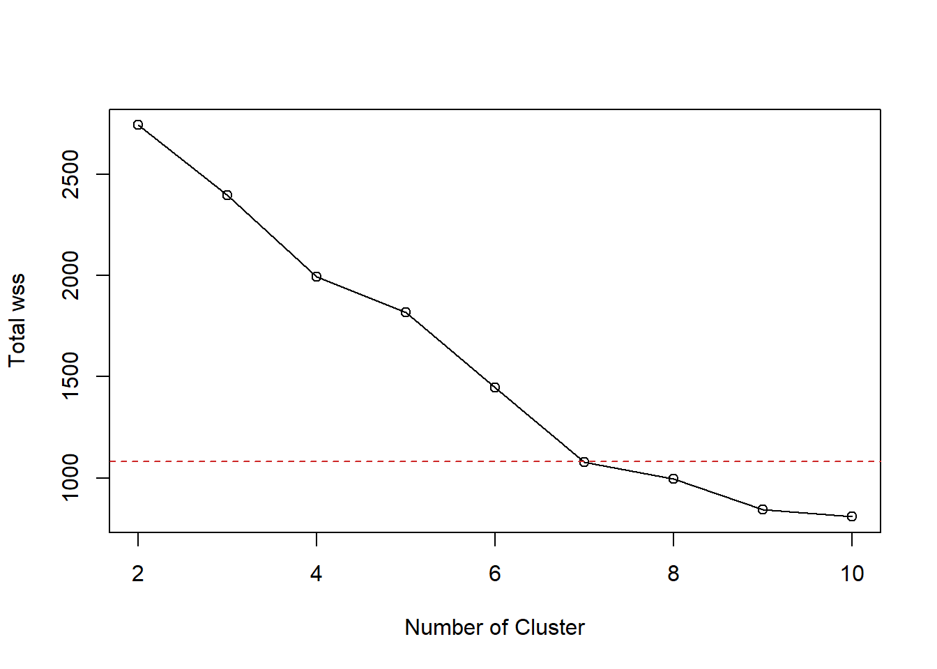 Berdasarkan elbow plot diatas dapat dilihat ketika jumlah cluster ditambah dari 7 ke 8 penurunan nilai total withinss sudah tidak pesat lagi, sehingga jumlah cluster yang diambil adalah 7.