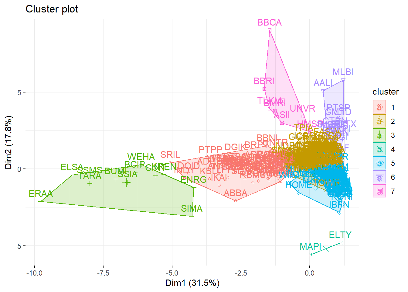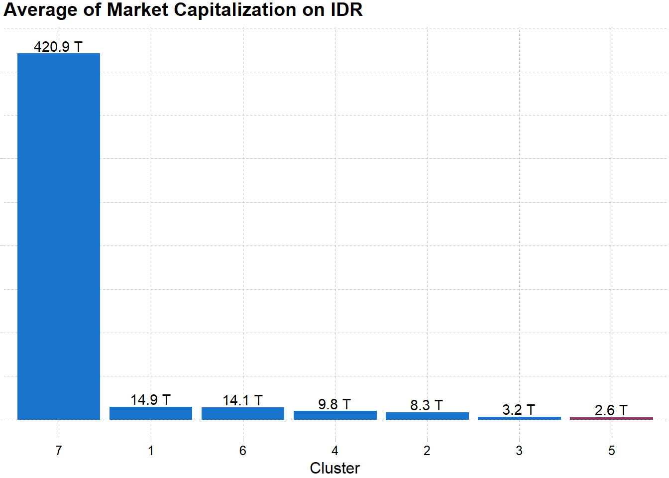 Cluster 7 merupakan cluster dengan jumlah anggota 7 emiten. Cluster ini memiliki rata rata market cap terbesar bila dibandingkan dengan cluster lain. Anggota dari cluster ini merupakan ASII, BBCA, BBRI, BMRI, HMSP, TLKM, UNVR yang merupakan emiten dengan market cap terbesar di bursa per Desember 2019.