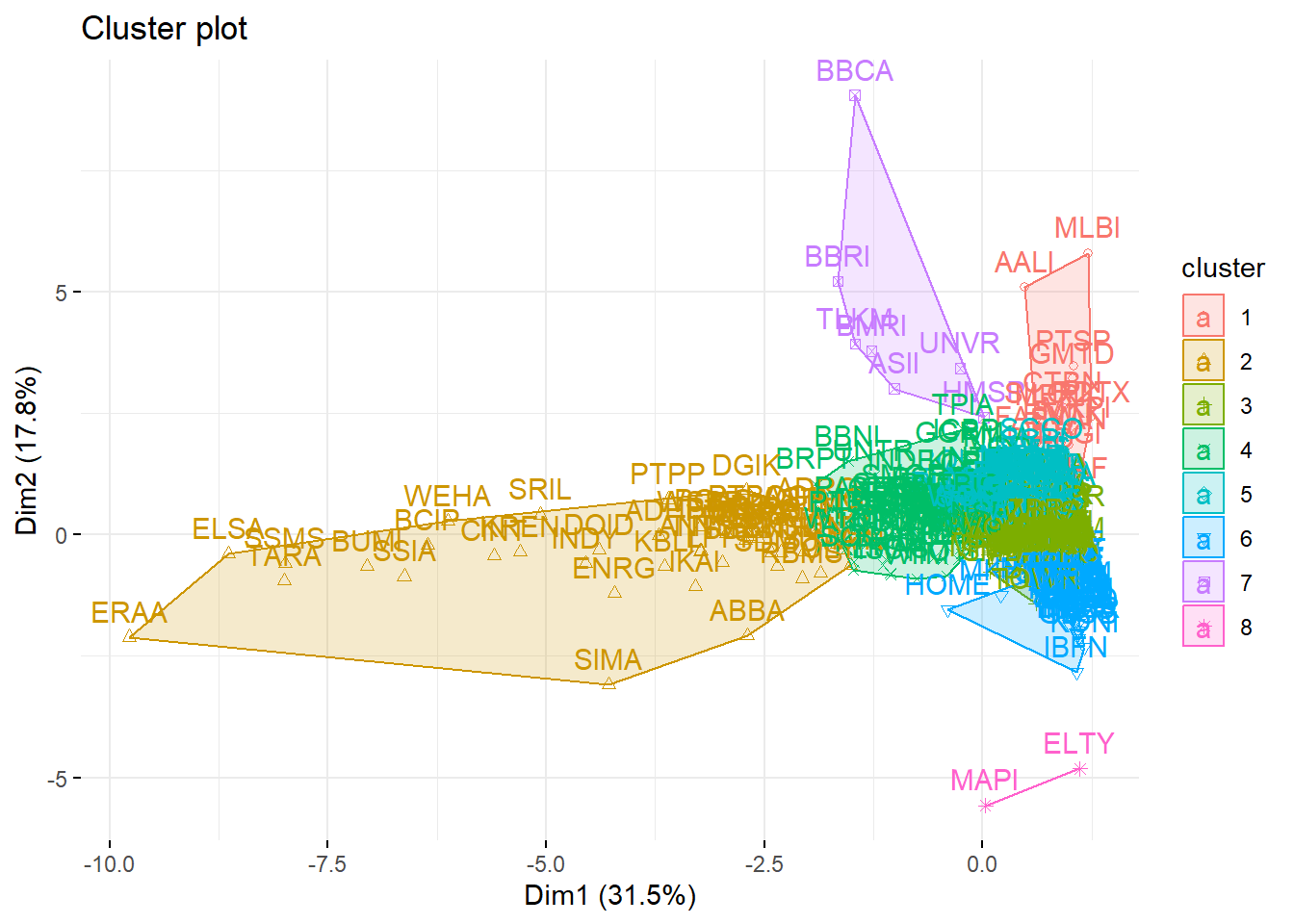 Cluster 4 merupakan cluster dengan anggota terkecil, yang hanya di isi oleh ELTY, dan MAPI. cluster 4 terbentuk karena tingginya nilai volatilitas pada tahun 2018