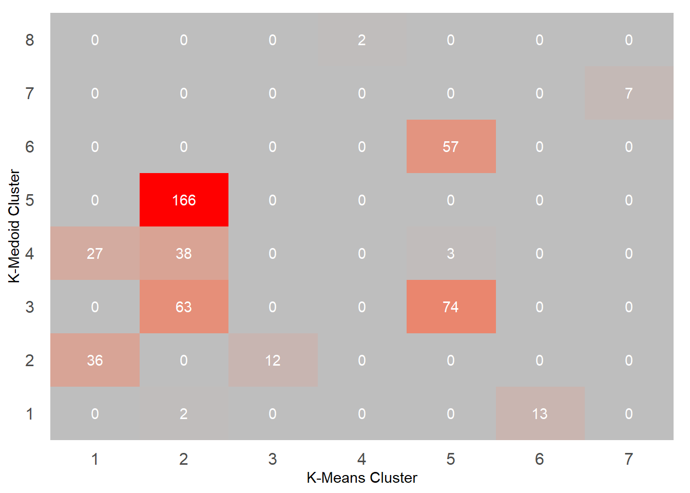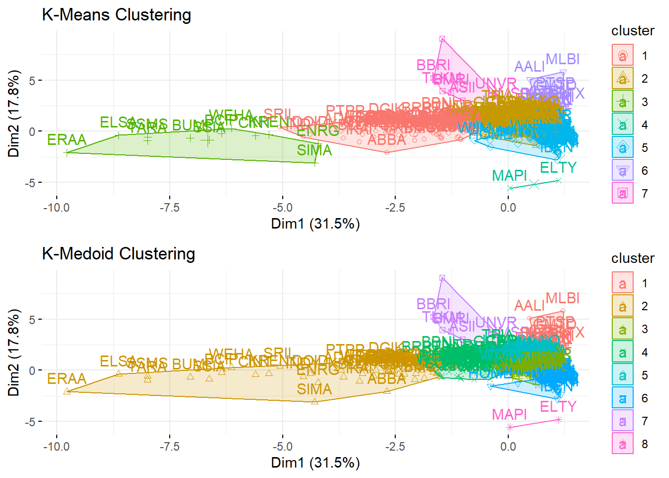 Hasil clustering antara K-Medoid dan K-Means bila dilihat secara jumlah cluster dan wss tidak tidak terlalu jauh berbeda. Algoritma K-Means menghasilkan cluster sebanyak 7 dengan total wss sebesar 1080, sedangkan algoritma K-Medoid menghasilkan 8 cluster dengan total wss sebesar 1100. Bila hasil hasil kedua clustering tersebut dibandingkan secara langsung maka menghasilkan visualisi seperti dibawah.