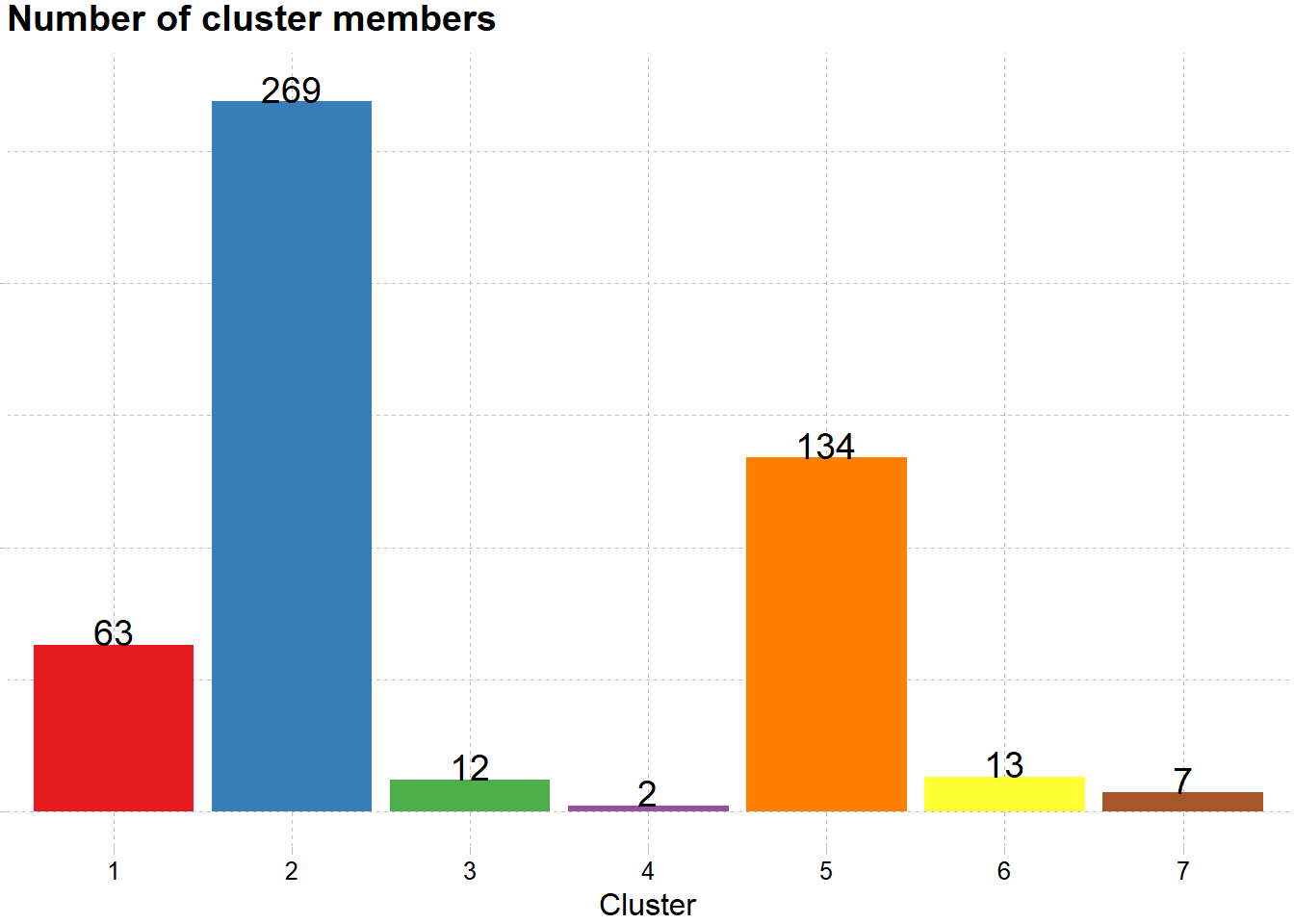 Dari hasil visualisasi diatas dapat dilihat luas area dan jumlah anggota cluster berbeda. Hasil cluster dapat dilihat pada data dibawah, pada cluster 4 merupakan cluster dengan anggota terkecil yaitu 2 data, sedangkan cluster 2 merupakan cluster terpadat dengan jumlah anggota sebesar 269 data dengan nilai total wss sebesar 272.