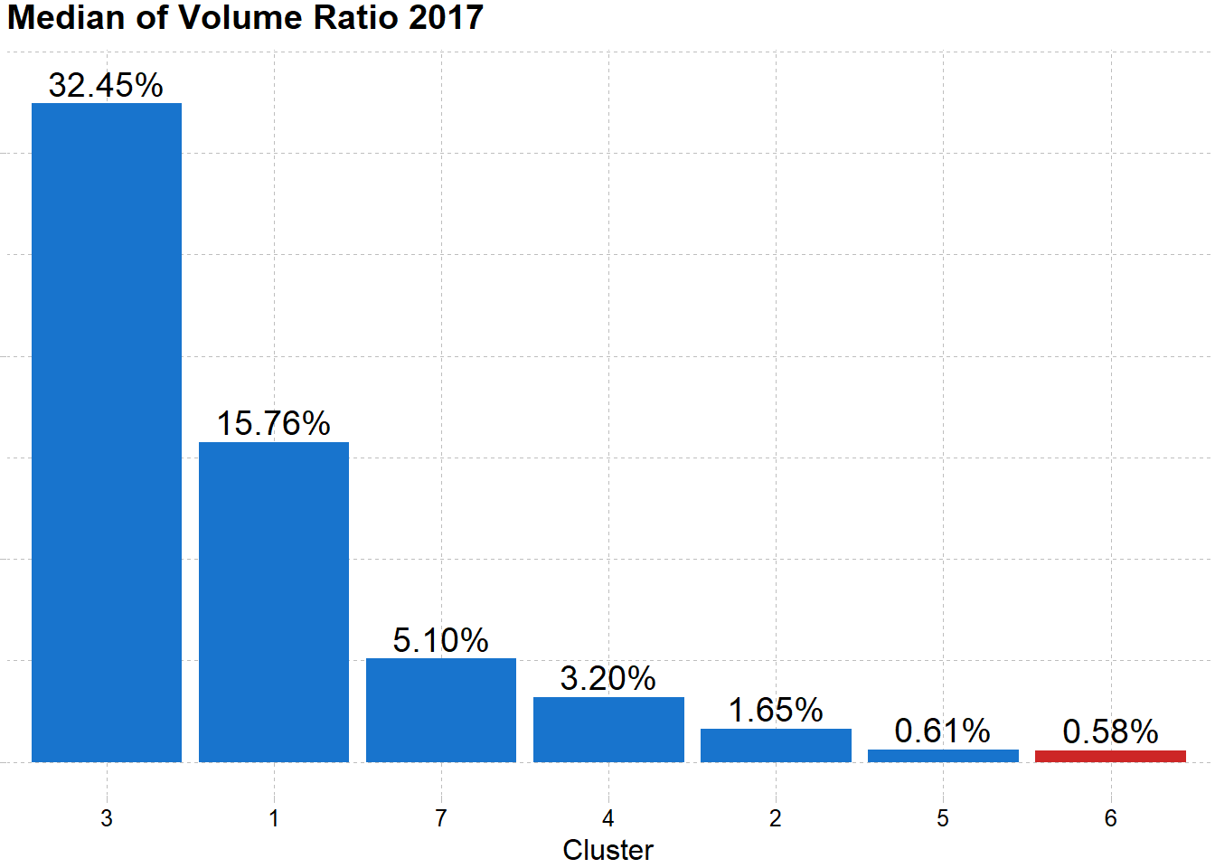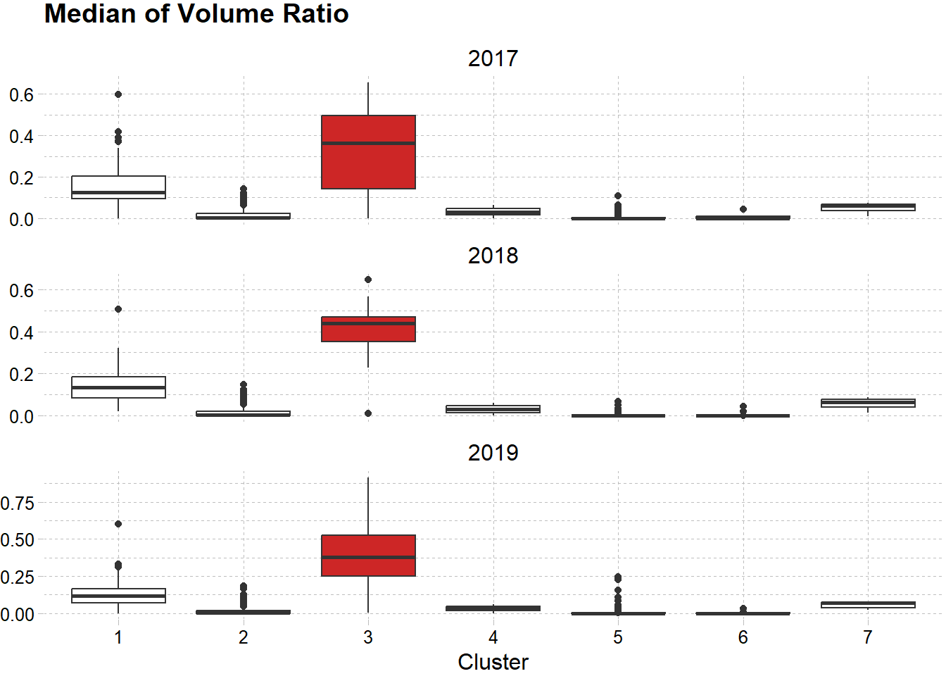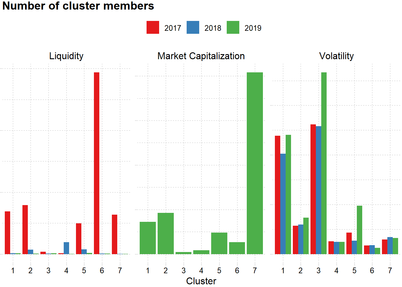 Walaupun pada tahun 2017 cluster ini paling volatile namun hal tersebut berbanding terbalik dengan likuiditasnya. Nilai median dari volume di tahun yang sama menunjukkan cluster ini merupakan cluster paling tidak liquid.