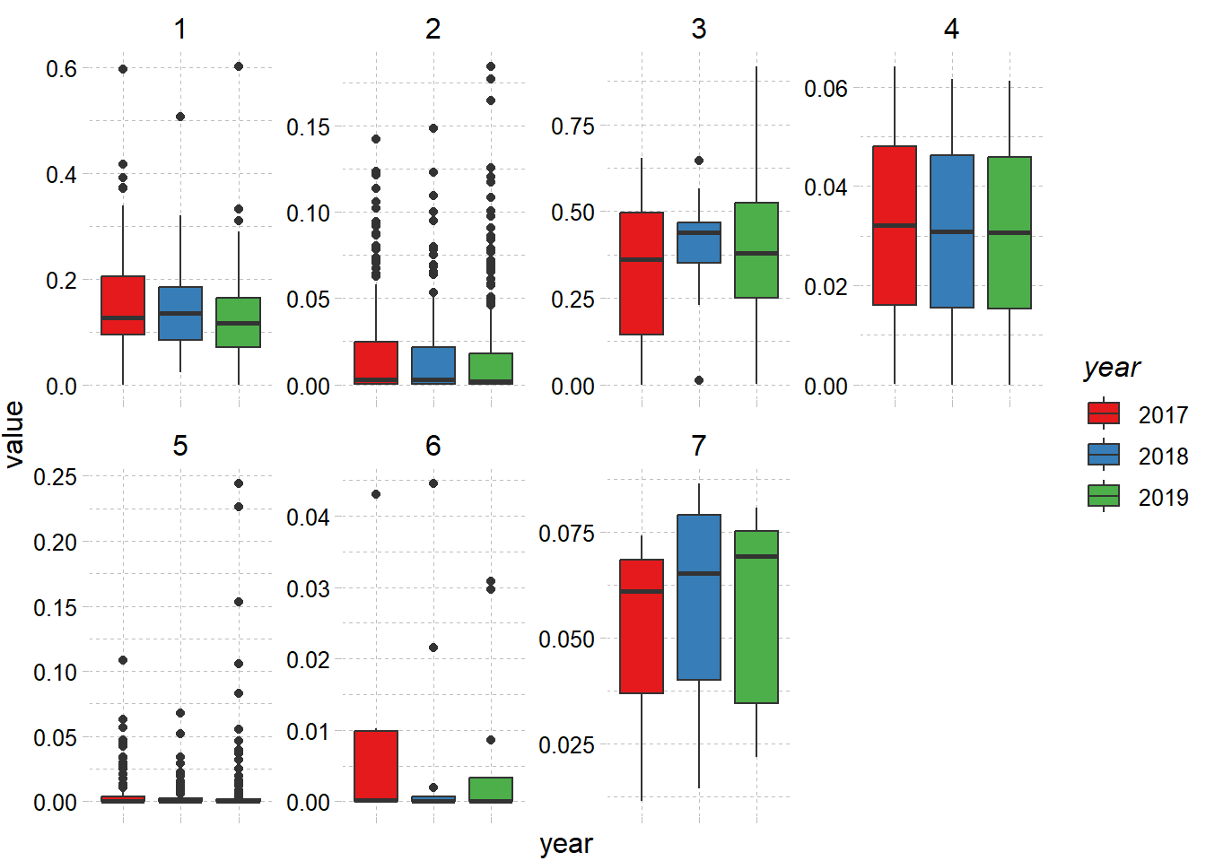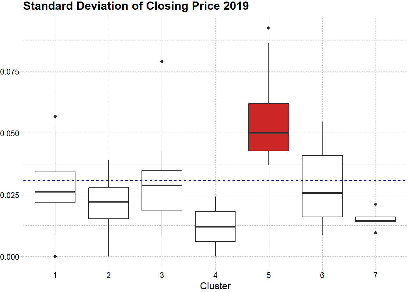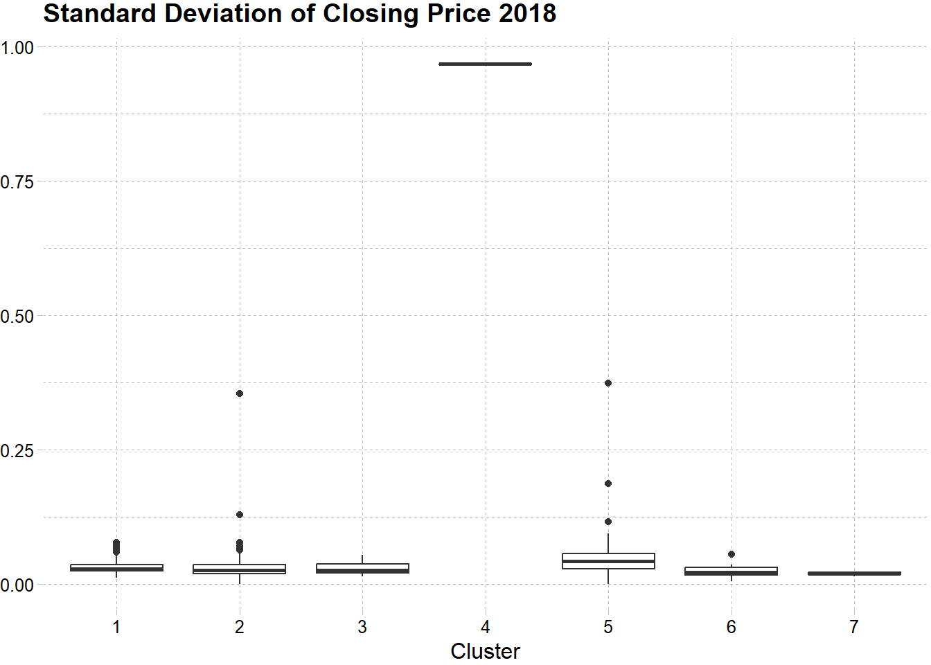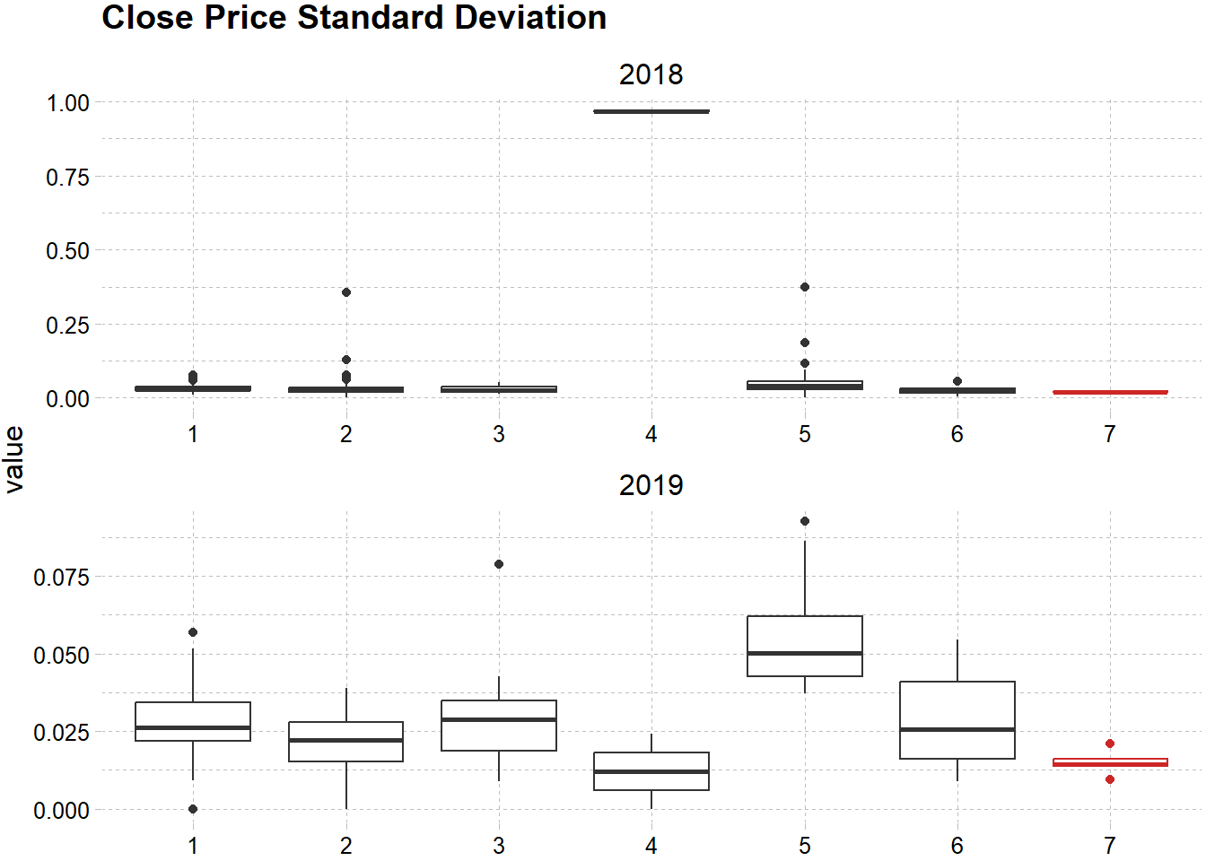 Volatilitas cluster ini pada tahun 2018 dan 2019 relatif rendah bila dibandingkan cluster lain. Rendahnya volatilitas dapat dilihat pada boxplot dibawah. Garis tengah pada boxplot (median) cluster 7 lebih rendah dibandingkan cluster lain, dan variansi dari data juga terlihat kecil, yang mana bisa ditunjukkan dari tipisnya box yang terbentuk.