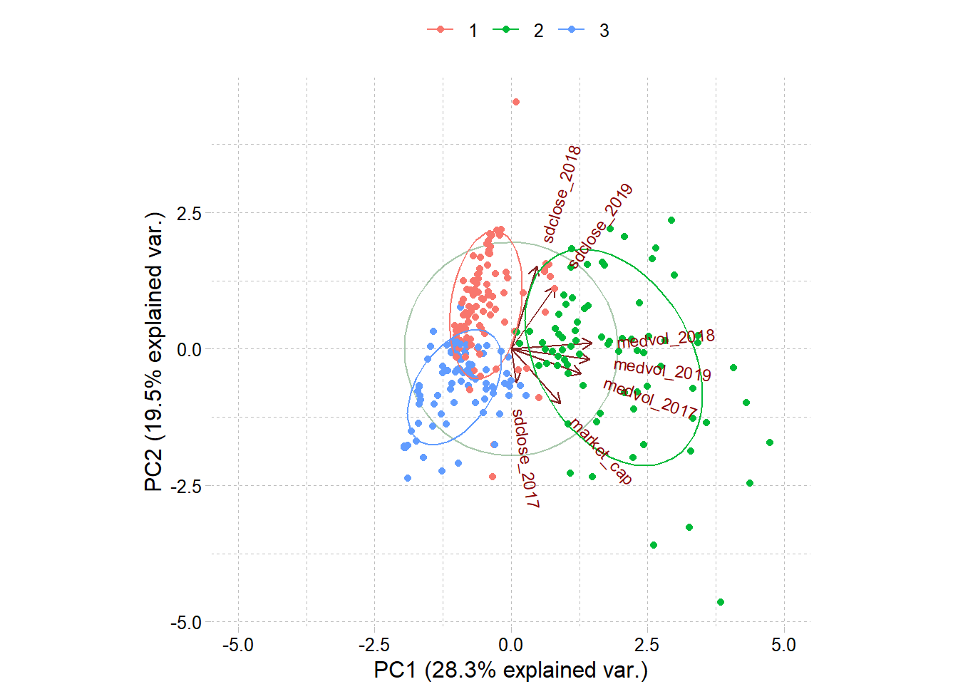 Berdasarkan hasil clustering menggunakan K-Medoid didapat 3 cluster seperti dibawah. sub-cluster 2 (warna hijau) merupakan cluster paling aktif, hal ini ditunjukkan dengan searahnya sebaran data tersebut dengan variabel medvol yang menunjukkan likuiditas. sub-cluster 1 memiliki arah yang berlawanan dengan variabel sdclose yang menunjukkan nilai volatilitas, sedangkan sub-cluster 3 berlawanan dengan sdclose_2017, serta market_cap.