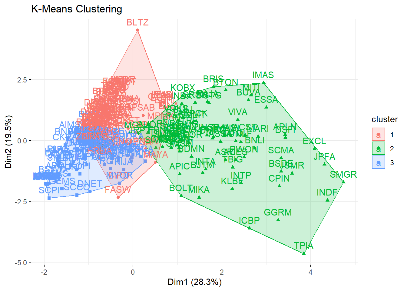 Terdapat 2 warna pada biplot diatas yaitu merah dan hitam, emiten dengan warna merah merupakan emiten yang diindikasikan outlier. Emiten yang berwarna merah menyebar cukup jauh dari sebaran data yang lain (warna hitam). Emiten yang diindikasikan sebagai outlier tidak akan digunakan dalam proses clustering agar cluster yang terbentuk representatif.