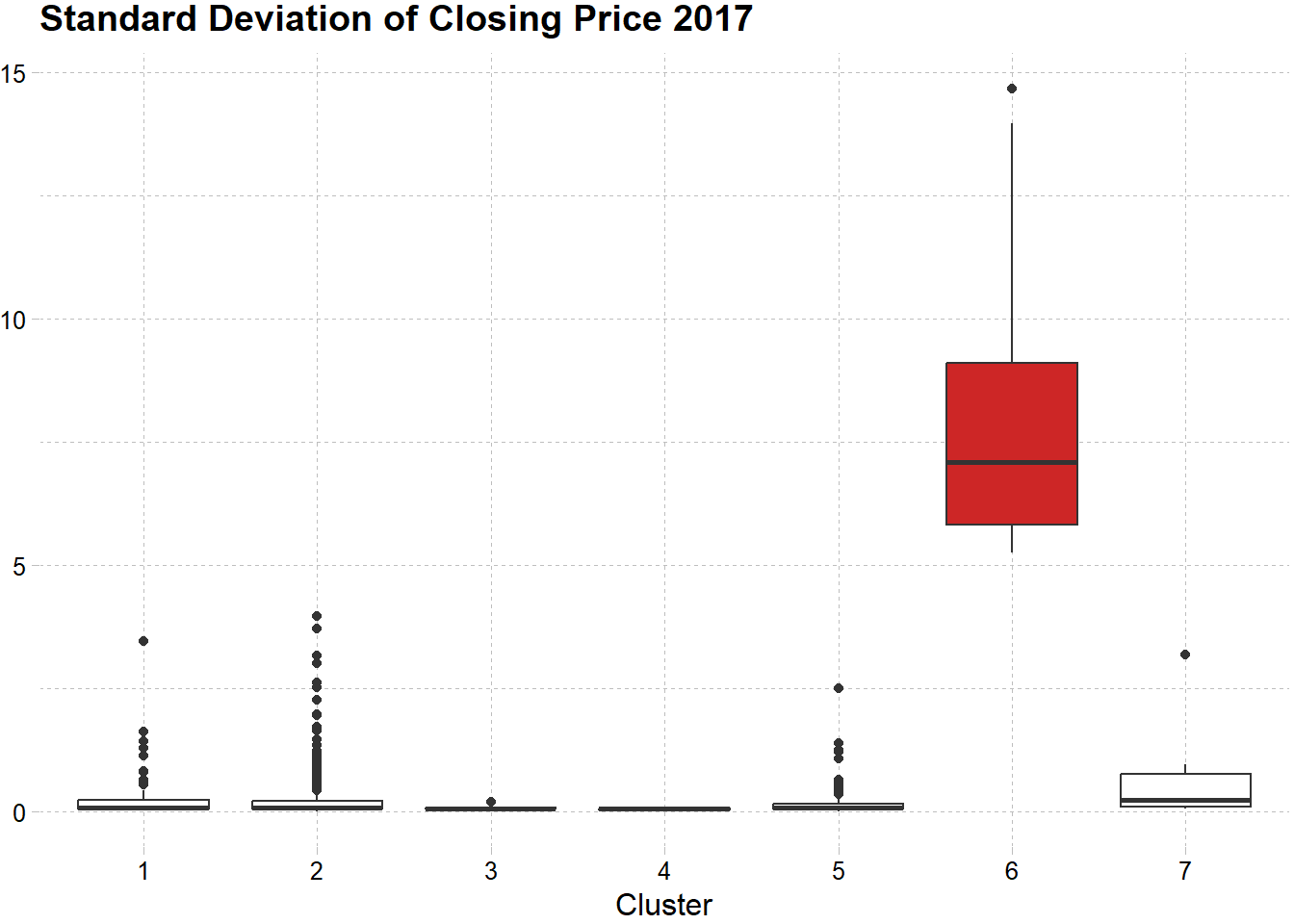 Cluster 6 merupakan cluster paling volatile di tahun 2017. Bila dilihat dari boxplot nilai standar deviasi tahun 2017 jauh diatas cluster yang lainnya, bahkan nilai minimum dari cluster tersebut lebih tinggi dari nilai maksimum pada cluster lain.